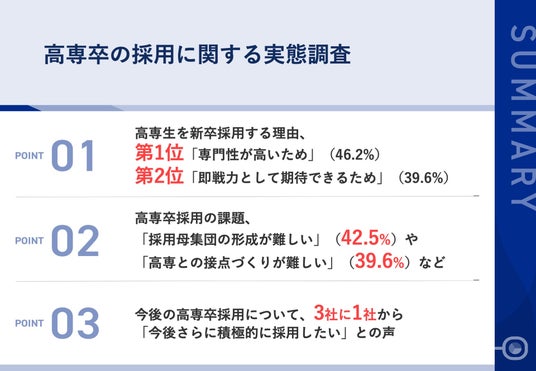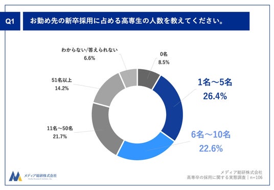 企業と学生をつなぐ多様なサービスを提供する、メディア総研株式会社(本社:福岡県福岡市、代表取締役社長:田中 浩二)は、高等専門学校生を採用している企業の採用責任者・担当者106名を対象に、高専卒の採用に関する実態調査を実施しましたので、お知らせいたします。