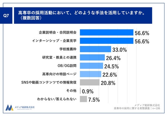 「Q7.高専卒の採用活動において、どのような手法を活用していますか。(複数回答)」(n=106)と質問したところ、「企業説明会・合同説明会」が56.6%、「インターンシップ・企業見学」が56.6%、「学校推薦枠」が33.0%という回答となりました。