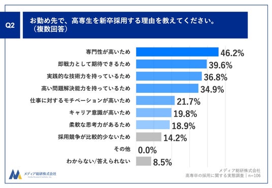 「Q2.お勤め先で、高専生を新卒採用する理由を教えてください。(複数回答)」(n=106)と質問したところ、「専門性が高いため」が46.2%、「即戦力として期待できるため」が39.6%、「実践的な技術力を持っているため」が36.8%という回答となりました。