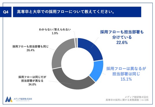 「Q4.高専卒と大卒での採用フローについて教えてください。」(n=106)と質問したところ、「採用フローも担当部署も分けている」が22.6%、「採用フローは異なるが担当部署は同じ」が15.1%という回答となりました。