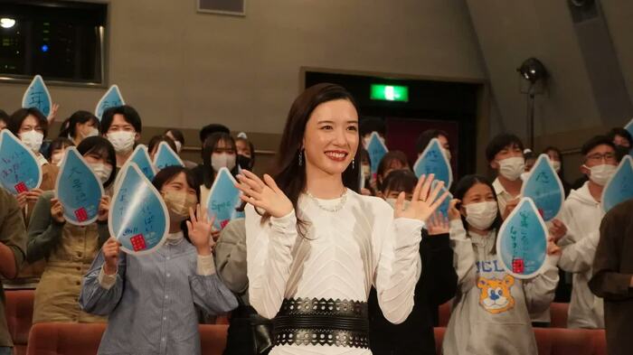 続いて「小さいころからピアニストを目指していて、受験を控えているので応援してほしい」という学生には、「すごーい!」と目を見開き、「(役で)実際にやってみて、ピアノの大変さを知りました」と振り返った。「プロのピアニストを目指すことは本当にすごいことだと思うので、応援してます、頑張ってください」とエールを送り、さらに「皆さん、拍手をしてください」と促すと、会場からは大きな拍手が起こった。