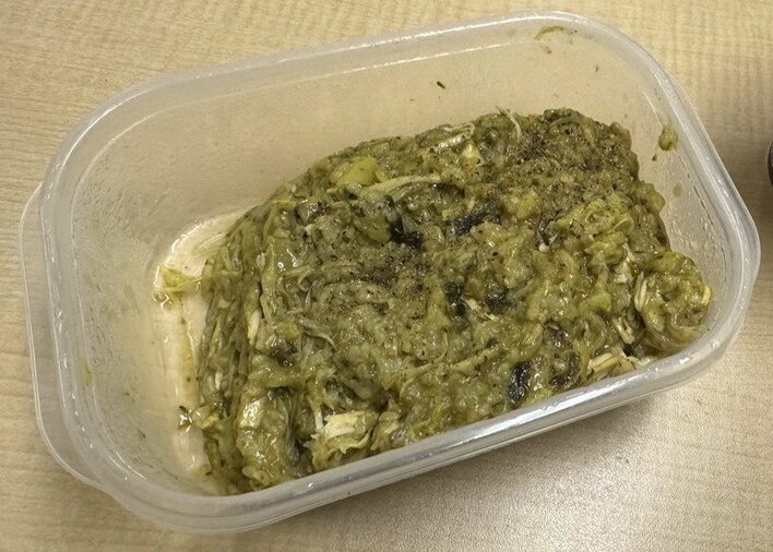 写真を見ると、スープが入っていると思われる紙コップの隣に…ぐにゃっとした“謎の緑色”の食べ物が入った、保存容器がテーブルに置かれています!きのこやお米が入っているようにも見えますが、お弁当を見たファンからは「ブロッコリーのリゾットですか?」「もずく?」「海ぶどう丼?」「ジェノベーゼ?」「グリーンカレー??」など緑に関連するメニュー名を挙げる声が続々。