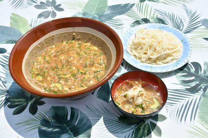 松岡がすったごまに、きゅうり、味噌、だし汁などを入れたものを晴美さんが味見すると、「(味が)ちょうどいい」とお墨付が。そのだし汁を器によそい氷を入れたら完成!松岡は、うどんをつけて豪快にすすった。