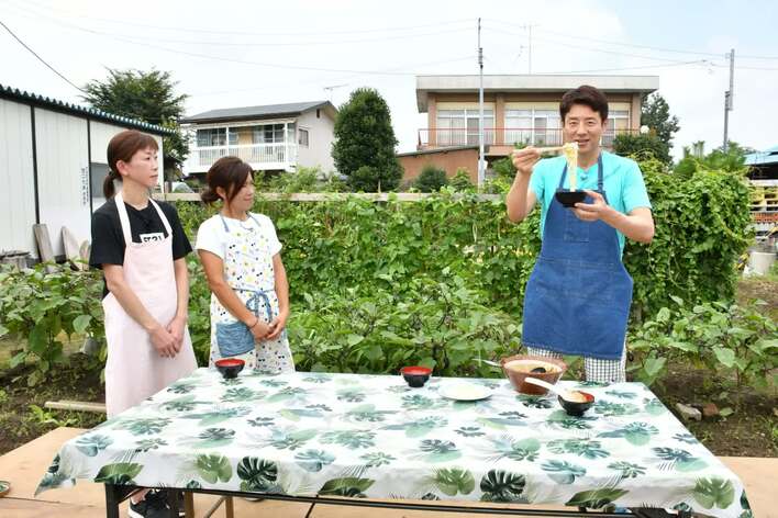 冷汁うどんの「すったて」は、川島町の夏の風物詩だ。松岡修造は「どうやって作っていきましょう」と気合十分な様子で、地元の晴美さんと良美さんに調理のレクチャーを受ける。