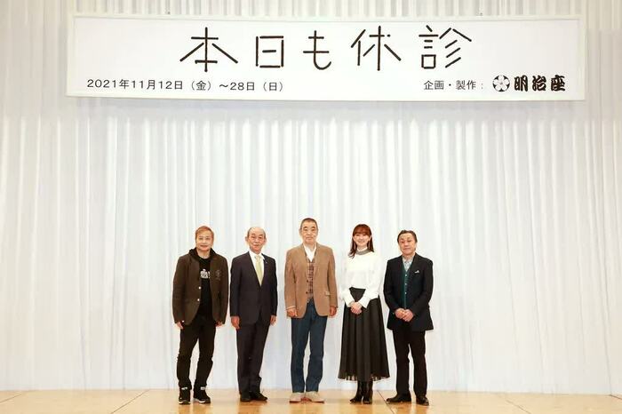 柄本明、花總まり、佐藤B作、笹野高史、ラサール石井が、10月21日(木)、舞台「本日も休診」の製作発表記者会見に登壇。50年来の“戦友”ともいえる俳優仲間との共演に、柄本が涙を見せる場面があった。