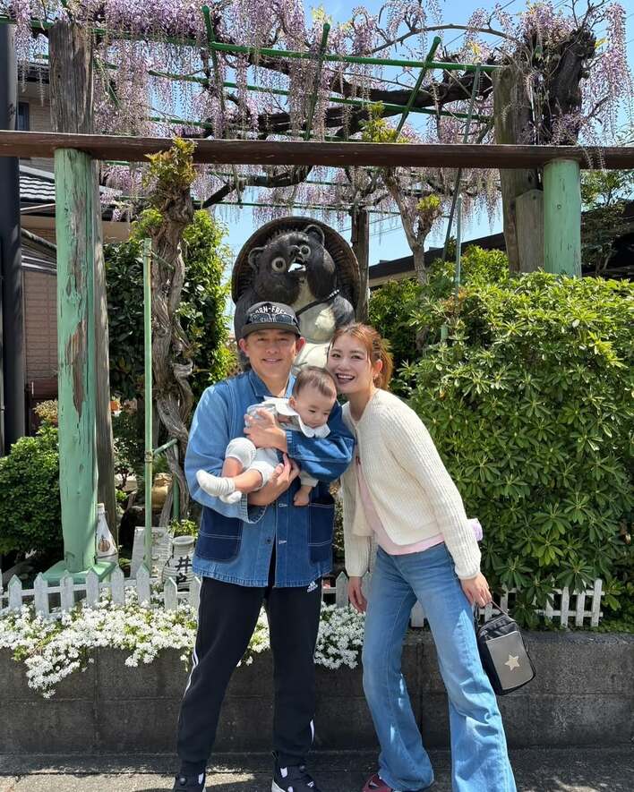 青空の下、爽やかなブルーのシャツにキャップ姿で長男を抱く井戸田さんと、それに寄り添う蜂谷さんからは仲睦まじい雰囲気が伝わってきます。