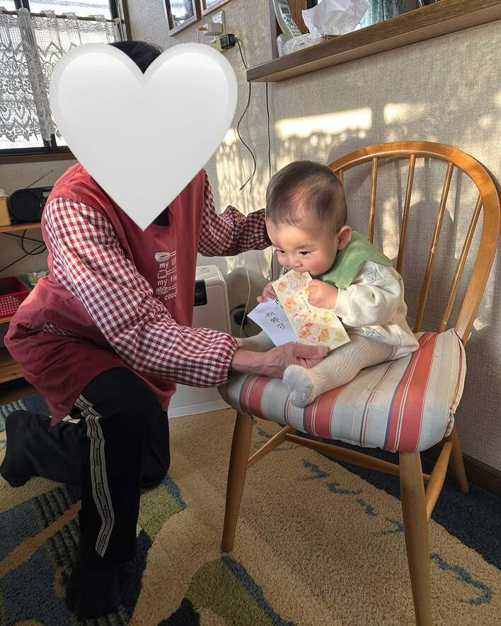 さらに、実家での長男の様子も投稿。祖母とみられる人の隣で、大人用の椅子におとなしくちょこんと座り、無邪気に紙を口に入れて遊んでる姿や...