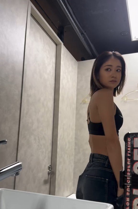 動画の冒頭、まずは着替えをしながら自分の体を鏡でチェックするみちょぱさん。