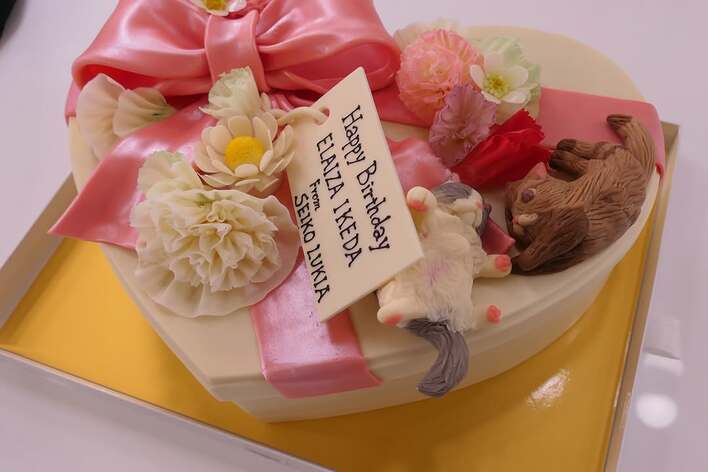 ピンクで統一されたケーキには、淡いカラーのお花や大きなリボン、ハートクッキーといった乙女心くすぐるデザインに。池田さんは「毎年恒例今年もガーリーで可愛い。母の中では私はずーっと子供なのね」と照れくさかったようですが、写真を見るとどこかうれしそうですね。