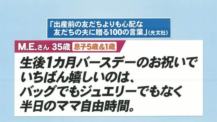 「努力?センス?頼もしいパパの条件」というテーマでは、「出産前の友だちよりも心配な友だちの夫に贈る100の言葉」(光文社)という書籍から、「バッグやジュエリーより、自由時間がほしい」などのママの本音が紹介された。