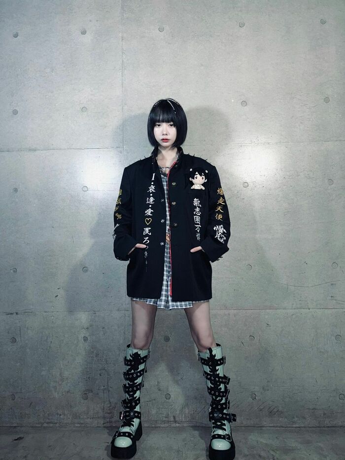 「氣志團万博2024」というコメントとともに、黒い学ランにギンガムチェックのミニワンピース、膝下まであるロングブーツ姿でカメラを見つめる自身の写真を投稿したあのさん。