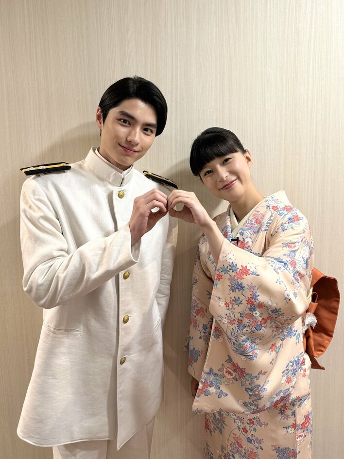 まずは『めざましテレビ』出演前の1枚。2人とも役衣装で、芳根さんは淡いピンク色をベースにした花柄の着物、本田さんは真っ白の軍服に身を包んで登場しました。