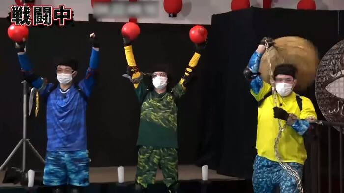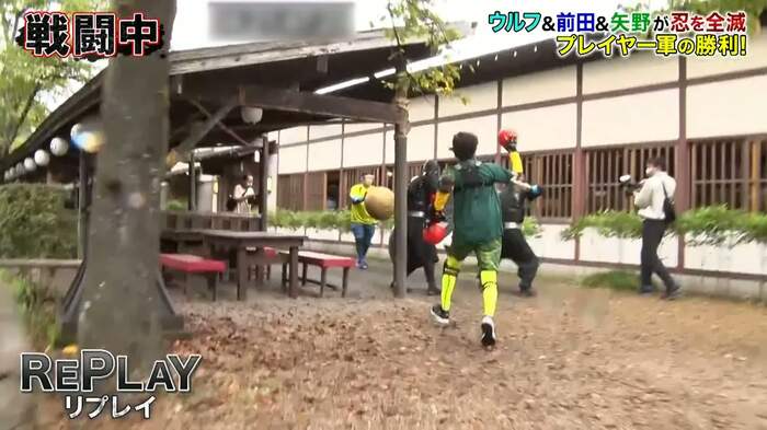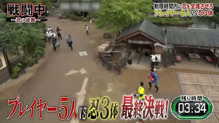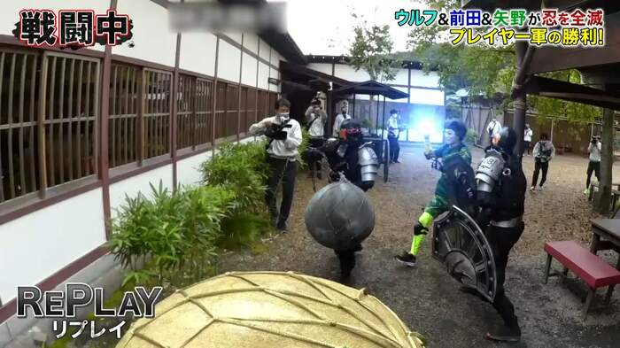 後半は、プレイヤー8人と、黒装束に身を包んだ「忍」9体のチーム戦。土井や矢野がさっそく忍を撃破したほか、ダイアン・津田篤宏は入手アイテムを使って忍2体を破る活躍を見せ、徐々に忍の数を減らしていく。