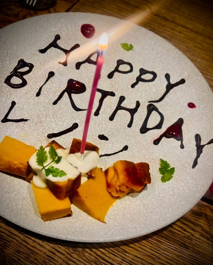 「HAPPY BIRTHDAY レノン」とお祝いメッセージが書かれたプレートや…