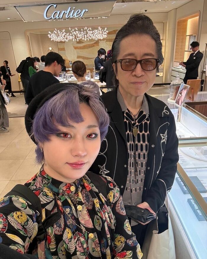 娘は赤いカラーコンタクトレンズに紫色の髪でクールなスタイルを見せ、高橋さんは娘の隣で優しくほほ笑んでいます。
