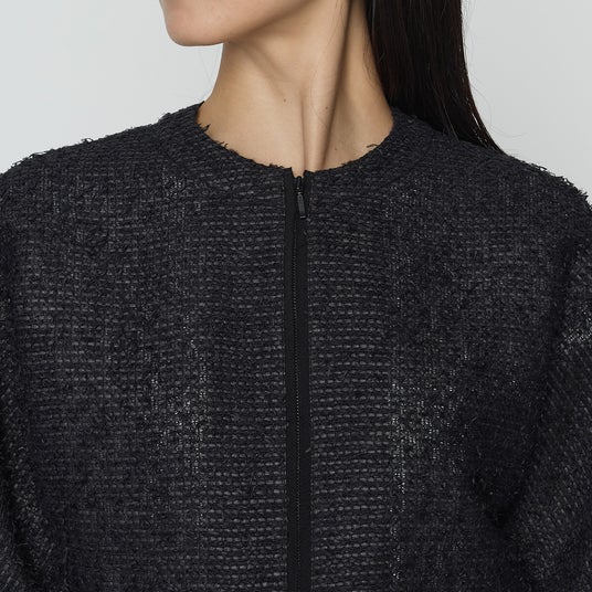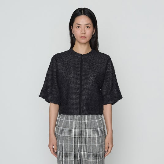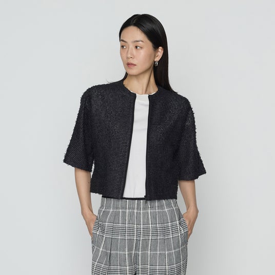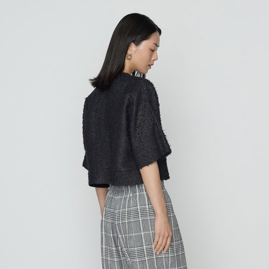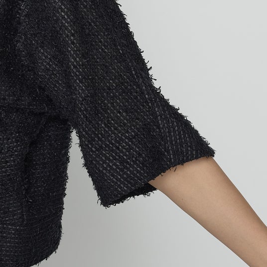 バジーレ28ならではのツイードとは何かを追求し、和紙を使用した春のツイードをつくりました。軽やかさと華やぎを兼ね備え、ブラックで仕上げた和紙カラミ素材です。