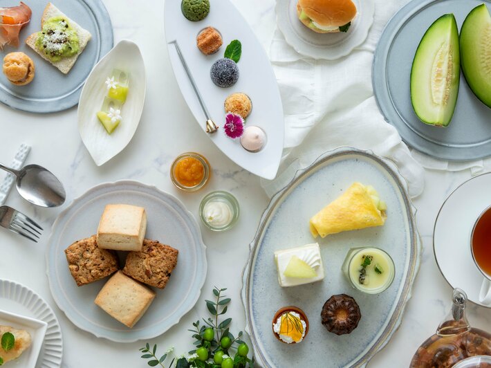 初夏に旬を迎えるフルーツ“メロン”をふんだんに使った、いち早く夏を先取りした期間限定のアフタヌーンティーが登場。様々な味わいでお愉しみいただけるようにこだわって仕上げたセイボリーはメロンの甘さと生ハムの塩気がマッチした甘じょっぱさを楽しめる「生ハム メロン」や「空豆とペコリーノのブルスケッタ」などをご用意。ドルチェは「メロンのショート」「メロンとモヒートのゼリー」、「メロンクレープ」など、みずみずしく爽やかな風味で夏の訪れを感じさせるアフタヌーンティーに仕上げました。