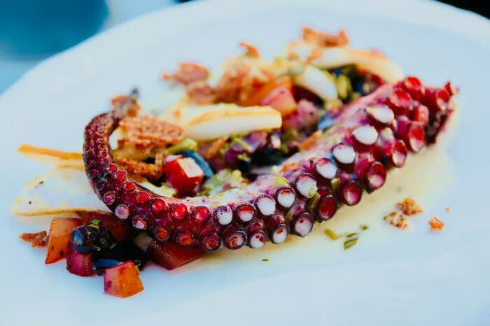 海に突き出たテラス席で食べる極上のメインディッシュのタコの炭火焼き。タコにナイフを入れるとスルッと切れてしまうほどに柔らかい。