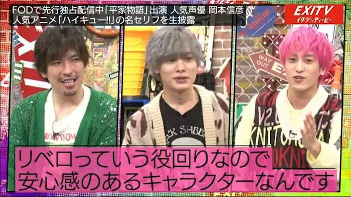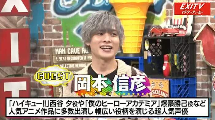 ゲストの声優・岡本信彦は登場すると、初対面のEXITの2人に対して「初めて見たときから勝手に『これは売れるぜ』って思っていました」と語る。りんたろー。も、「僕たちもやっと岡本さんを呼べるようになりました」と感慨深そうに思いを伝えていた。