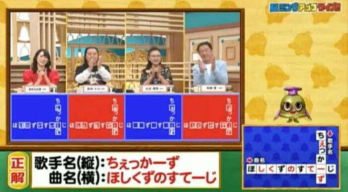正解は、歌手名が「ちぇっかーず(チェッカーズ)」で曲名が「ほしくずのすてーじ(星屑のステージ)」。小力と布施が正解!