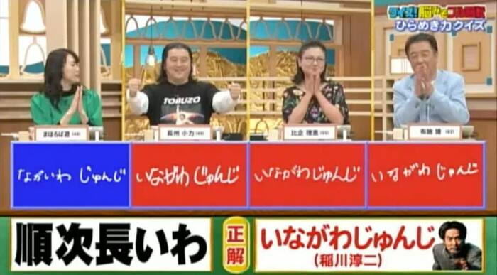 正解は「いながわじゅんじ(稲川淳二)」。小力、比企、布施の3人が見事正解!