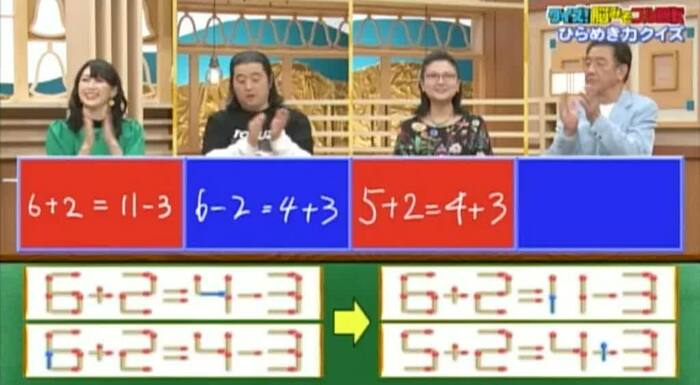もう一つは、 左の式の「6」から1本動かし「5」にする。それを右の式の「-」に足して「+」にすれば「5+2=4+3」となる。まほろばと比企の2人が正解!