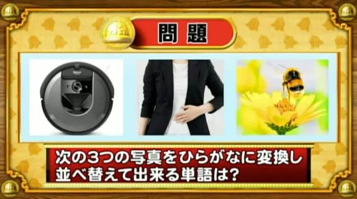 最初は「脳ミングアップクイズ」から、シャッフル写真の問題。次の3つの写真をひらがなに変換し、並べ替えて出来る単語は何か?