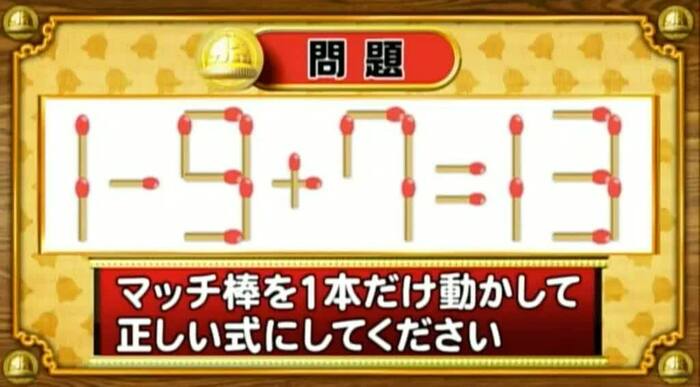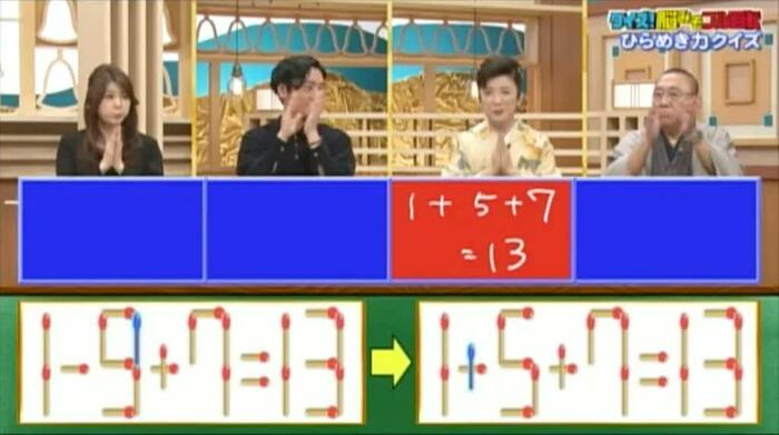 正解は、まず左の式の「9」から1本動かし「5」にする。それを「-」に足して「+」にする。そうすれば「1+5+7=13」となる。青木が見事正解!