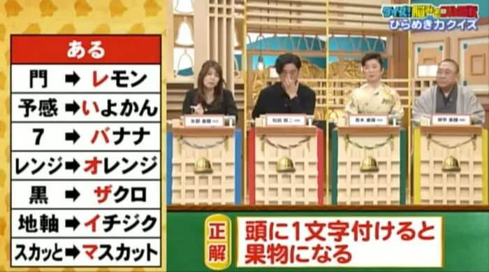正解は「頭に1文字つけると果物になる」。松田、青木、楽輔の3人が正解!