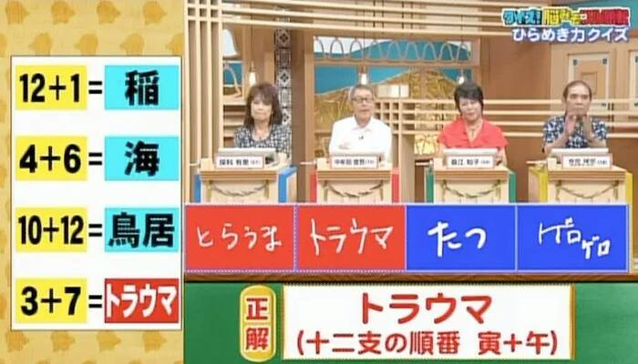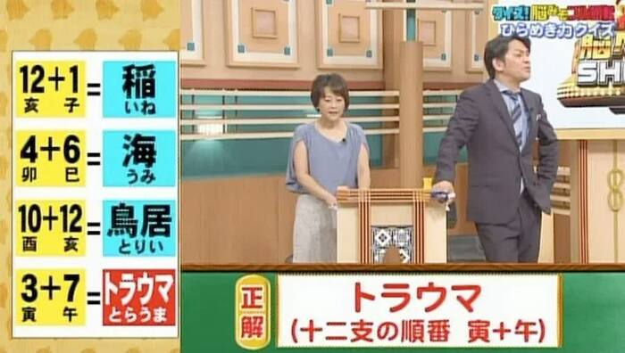 正解は「トラウマ(寅+午)」。数式の数字は、十二支の順番に対応していたのです。保科さん、中牟田さんが正解!