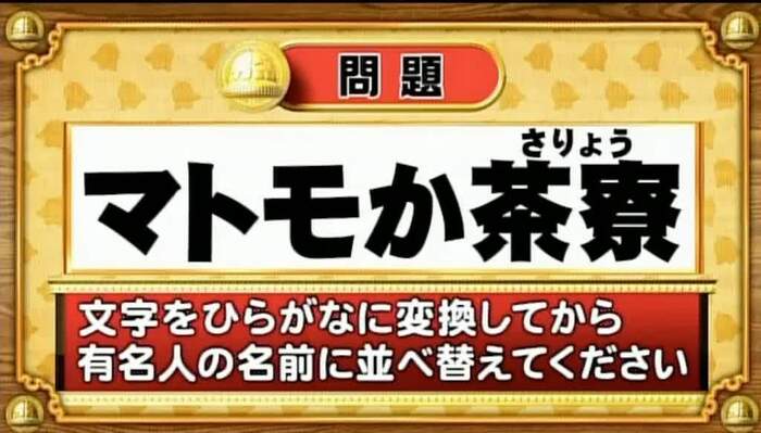 最後は、シャッフル人名問題。次の文字をひらがなに変換してから、有名人の名前に並べ替えてください。