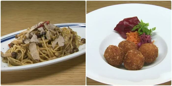 キノコとマッシュルームをたっぷり使った、サマートリュフときのこのペペロンチーノ(1500円)は、最後にイタリア産のトリュフをふりかけ、ニンニクとトリュフのハーモニーが一度に楽しめる一品。 ほか、北海道うにクリームコロッケ(750円)をいただき、 麦焼酎のソーダ割(650円)、 メリーニ /パッシェーノ(580円)で乾杯。※すべて税別