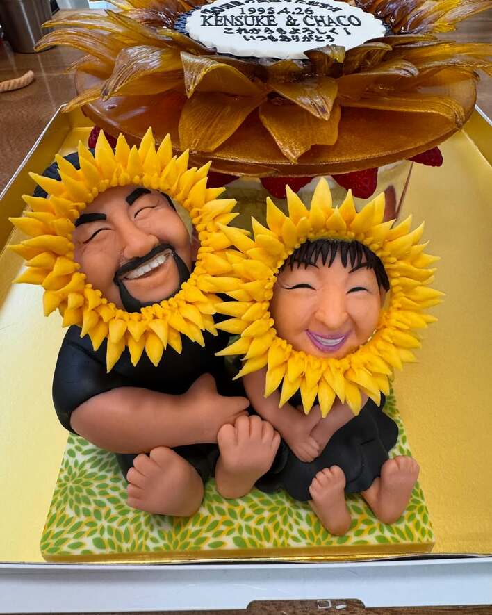 仲良く寄り添う2人が持つケーキには、そっくりなミニ北斗晶とミニ佐々木健介の人形型のケーキが!2人のトレードマークのパッと明るい笑顔をひまわりに見立て、顔の周りをひまわりの花びらが囲っています。