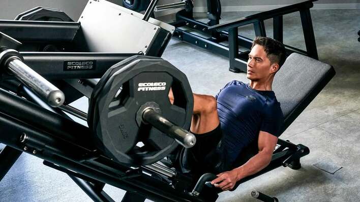 さらに、レッグプレスの様子を斜め前から写したショットでは、表情を崩すことなく背筋をピンと伸ばし、トレーニング機器に腰を下ろしている市原さん。