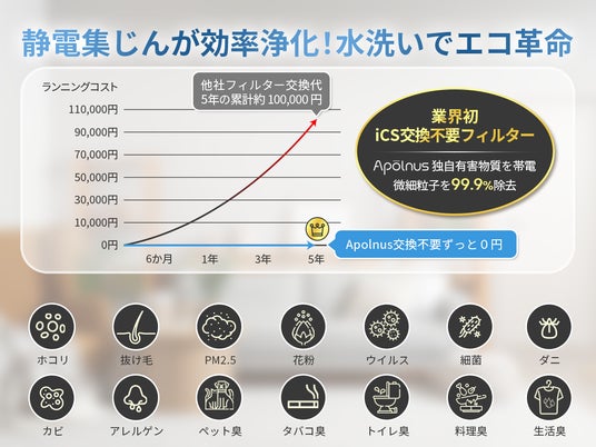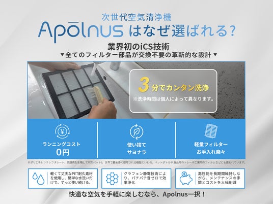 Apolnus Japanは持続可能性を追求した空気浄化ソリューションの開発に注力し、「フィルター交換不要」の革新的な設計で環境への負荷を軽減します。環境に配慮しながら、上質なライフスタイルを求める消費者に、快適で健康的な暮らしを提供することを目指しています。