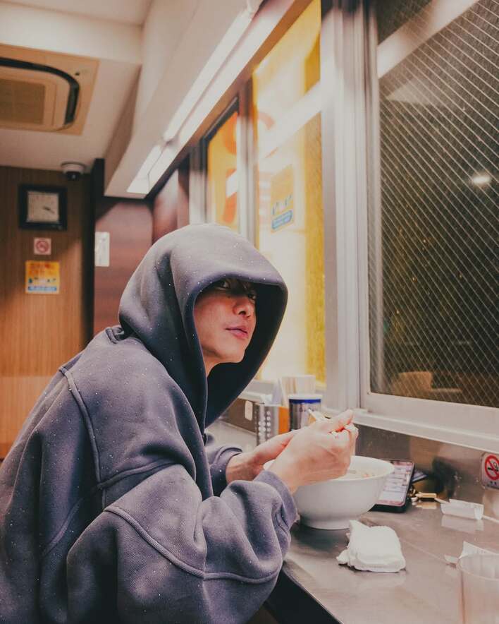 投稿された写真には、グレーのオーバーサイズのパーカーを目元まで深めに被り、カウンターでラーメンを食べる佐藤さんの姿が。