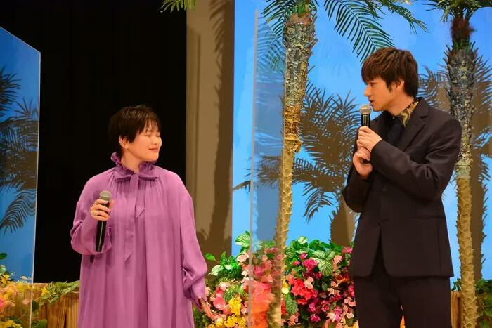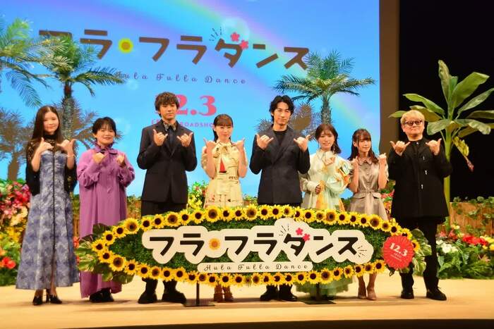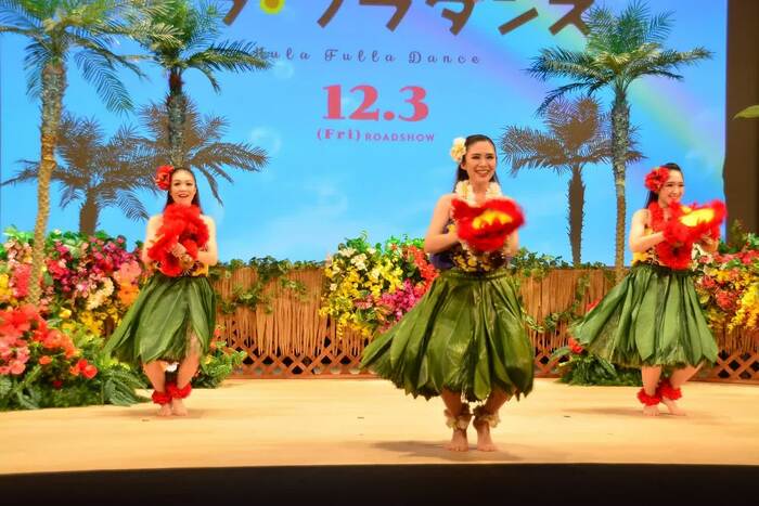 イベントは、フラガールによるフラダンスからスタート。スパリゾートハワイアンズの空気感に包まれた会場にキャスト、監督が登場すると「アロハ~」と挨拶を。