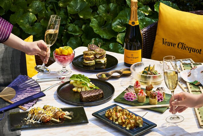 はしまき、粉もん、希少な大阪産黒毛和牛まで、お祭り定番フードや大阪の味覚にセントレジスの洗練されたアレンジを利かせて愉しむ、地上50メートルの天空の庭で過ごす夏の夜