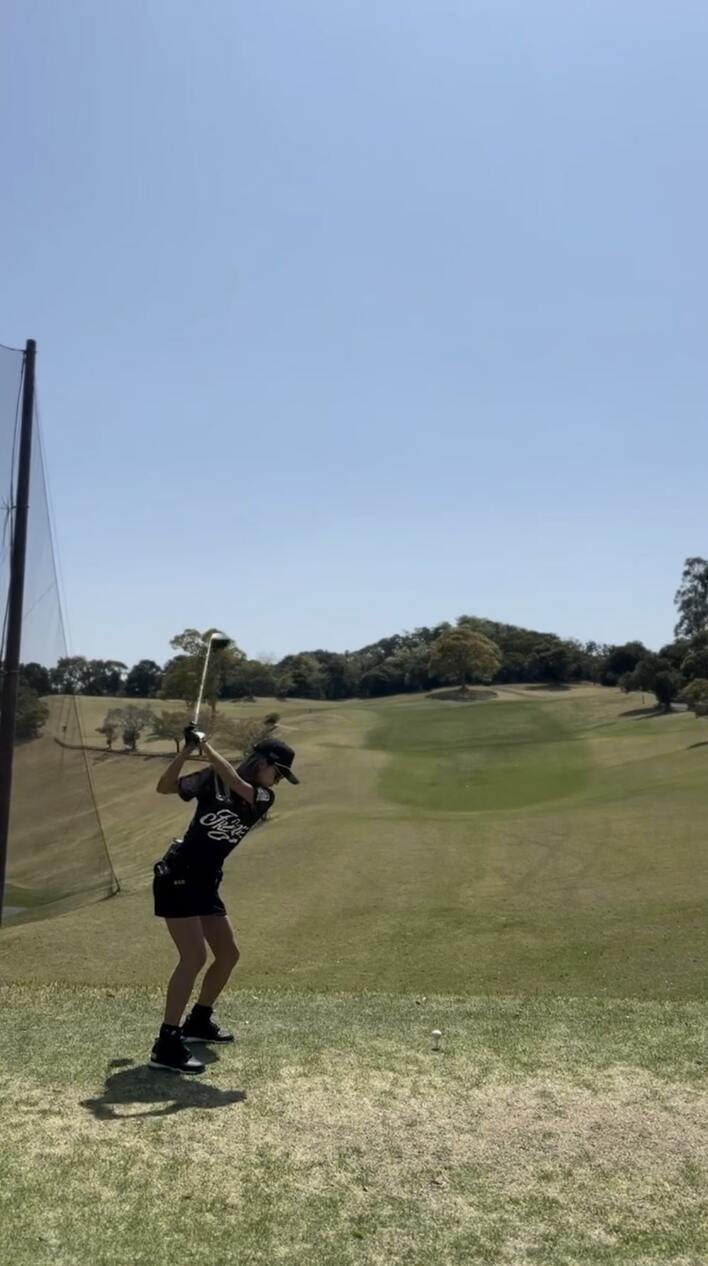 動画を見ると、キャップをかぶり、ミニ丈のゴルフウェアを着た全身黒コーデのみちょぱさんの姿が。青空の下、豪快なティーショットを披露しています。