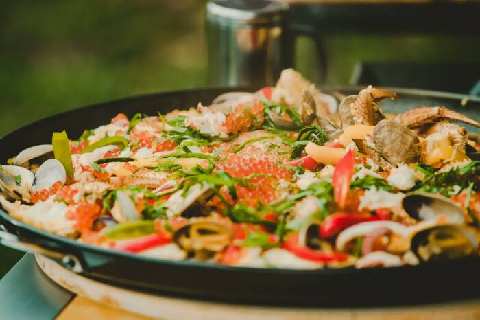 キャンプ飯で印象に残ったのは、お店では出すことのできない贅沢パエリアです。鉄板の上に北海道のおいしい魅力がいっぱい乗っています!超高級の食材が揃っていて、毛ガニとか…。仕上げにまさかの…これ以上は番組をご覧ください。