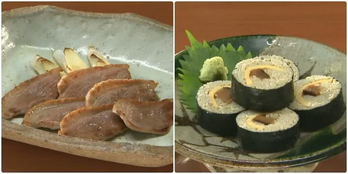 おつまみで人気の鴨とねぎのあいやき(1210円)は、脂身の少ないあっさりとしたカモを大島産の塩焼きで。ほか、そば寿し(550円)をいただき、そばによく合うお店オリジナルの「純米酒薮伊豆」で乾杯。※すべて税込