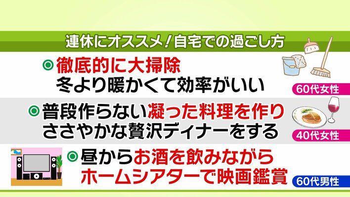 まず紹介されたのは、今年のゴールデンウィークは自宅で過ごす人が37.3%と例年より増加したというアンケート結果です。