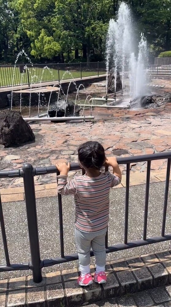 娘のぷくぷくちゃんが手すりをつかんでつま先立ちになり、奥に見える噴水を必死にのぞき込もうとしていました。