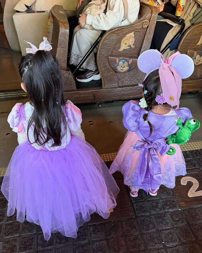 3歳の娘の様子も公開!「ベビちゃん'sでディズニーランドへ」と友人のお子さんと一緒におでかけをしたそう。写真にはそれぞれプリンセスの格好をした、かわいらしい2人のお子さんの後ろ姿を見ることができます。