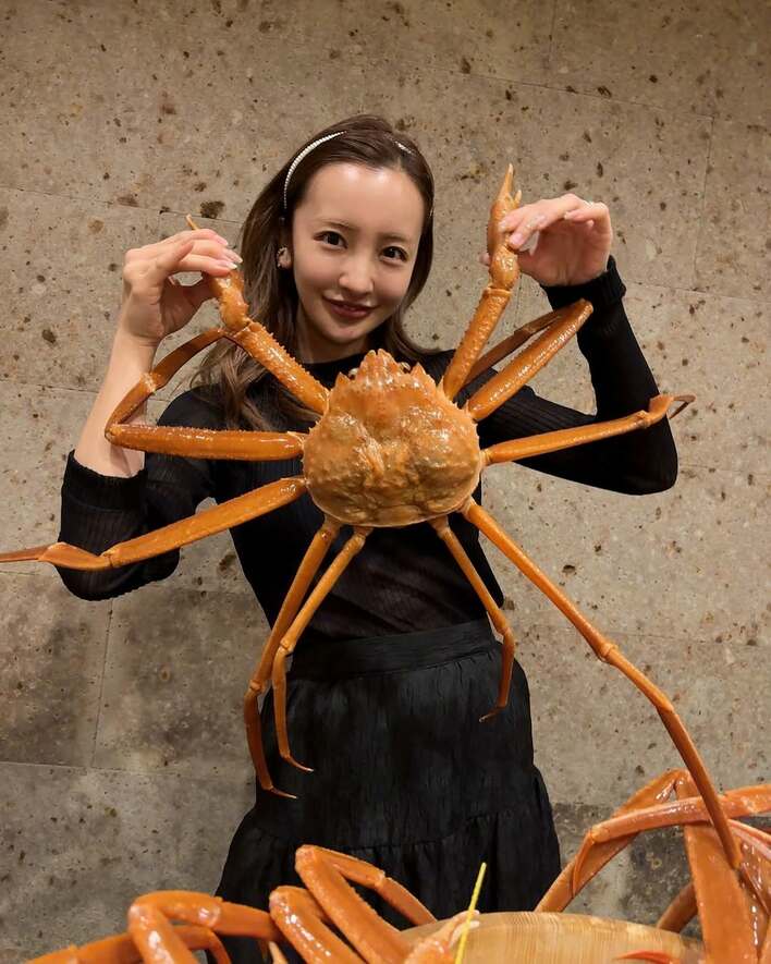 「最近の日」とつづり、大きなカニを持つショットや友人とのショットなど一挙に公開した板野さん。