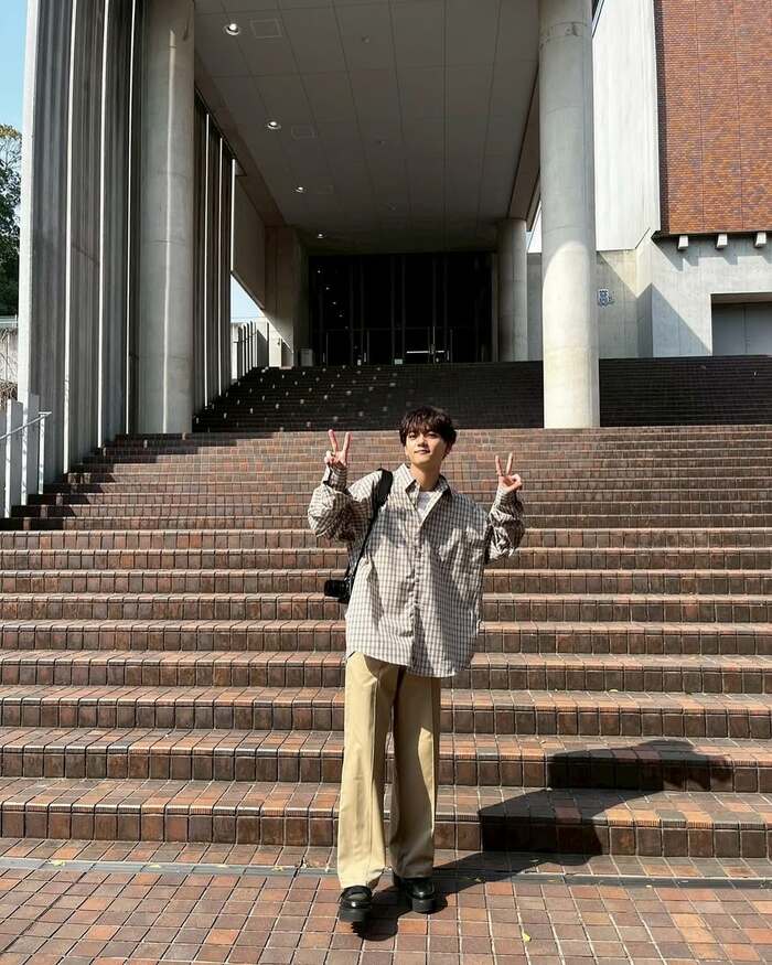オーバーサイズの白×茶色のチェック柄のシャツに、ベージュのボトムスを組み合わせたスタイル。カジュアルながらも爽やかで、学校の校名が書かれた看板の横で、ダブルピース!
