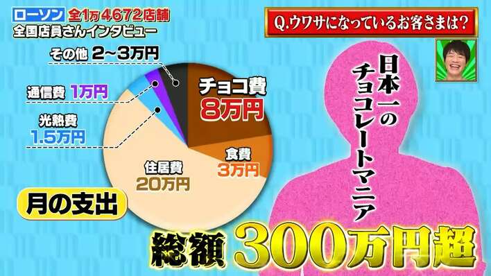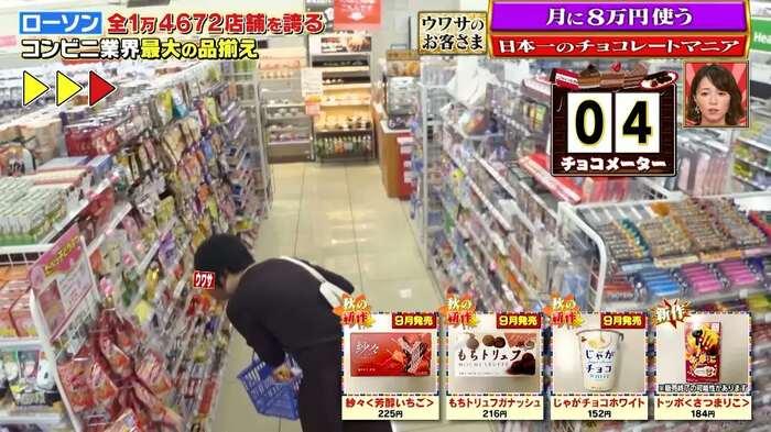 コンビニチェーン「ローソン」のある店でウワサになっているのは、チョコ好きが高じて総額300万円以上をチョコレートに費やしたほどの、日本一のチョコレートマニアな“お客さま”。店員さんのあいだでは、「火曜日にいらっしゃいます」、「新商品のチョコをよく買われている」、「カゴ2つ分くらい買われていて。レジがチョコのお菓子の山で…」と話題になっているという。番組では、その“お客さま”とコンタクトを取ることに成功し、「ローソン」での買い物の様子を観察させてもらった。