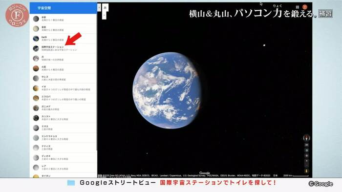 スタッフのアドバイスで航空写真に切り替え、どんどんズームアウトして地球と月が見える宇宙空間へやってきた2人。すると候補欄に「国際宇宙ステーション」が。