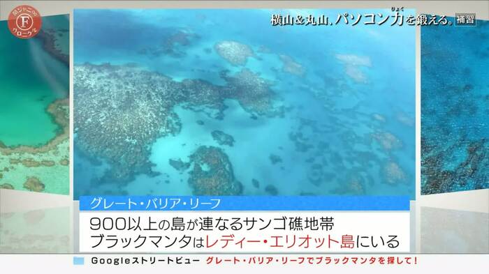 まずは「グレート・バリア・リーフにいるマンタの変異個体、ブラックマンタを探して!」と、まさかの海中生物のお題が。「グレート・バリア・リーフ」で検索をかけて、海の中に示されたポイントに行こうとするも、横山のマウス操作が上手くいかず地図上をさまよいだす。しかし、その後、ブラックマンタが生息する島の名前を入力し、周りの海からブラックマンタを探し当てた。