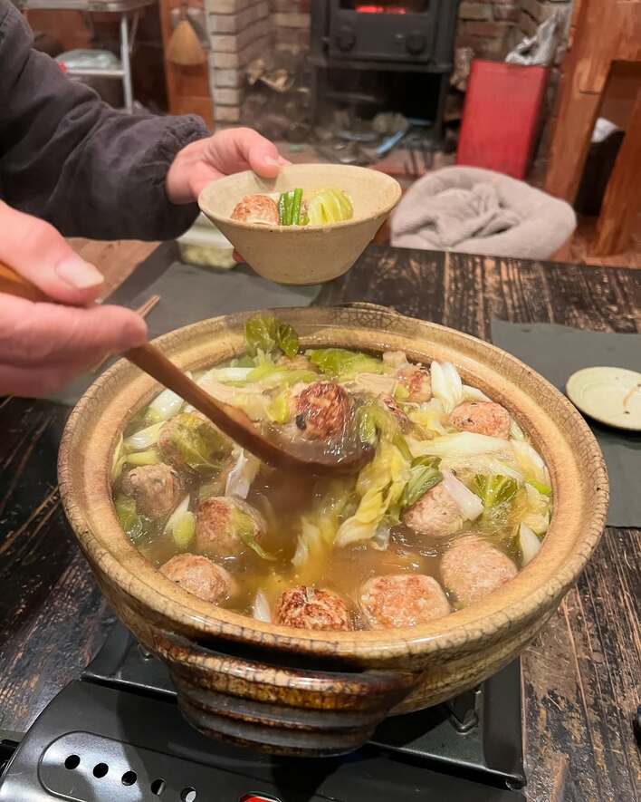 写真には春雨とたっぷりの野菜に大きな肉団子がゴロゴロっと入った鍋が。奥には赤く火の灯る薪ストーブが見えています。